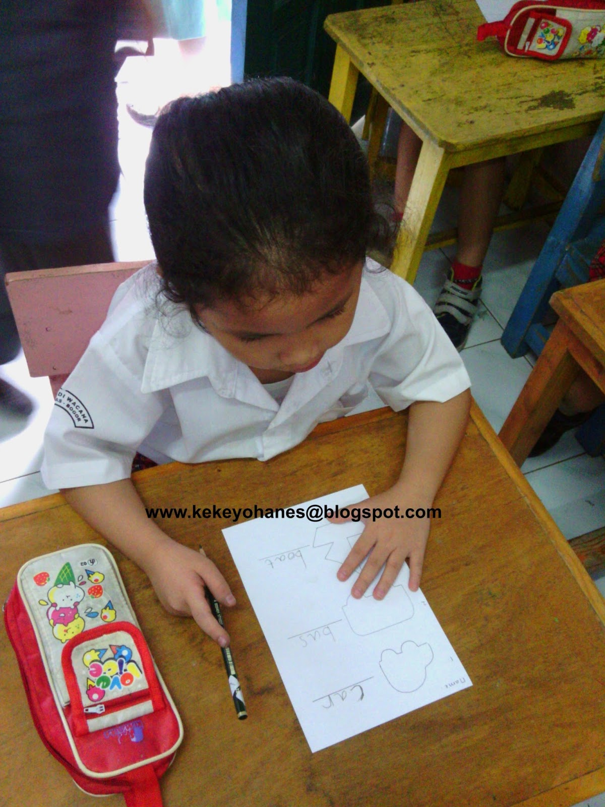 Khusus untuk kelas TK B saya memberikan mereka lima kata dalam bahasa Inggris untuk dihapalkan dan Selasa berikutnya saya memberikan mereka test untuk mengetahui apa mereka telah menghapalkannya.